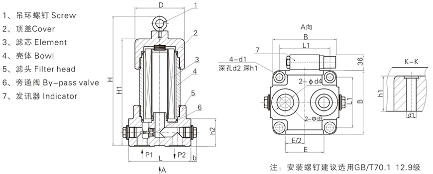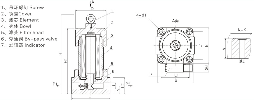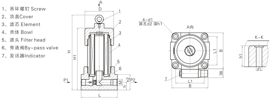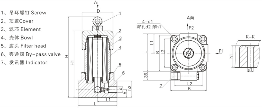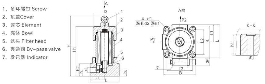 該過(guò)濾器設(shè)有壓差發(fā)訊裝置,當(dāng)濾芯污染堵塞到進(jìn)出油口壓差為0.35Mpa時(shí),即發(fā)出開關(guān)信號(hào),此時(shí)更換濾芯,以達(dá)到保護(hù)系統(tǒng)安全的目的。