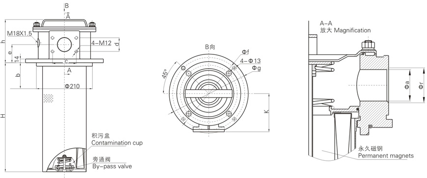 這種過濾器設(shè)有濾芯污染堵塞發(fā)訊器和油路旁通閥,當(dāng)回油壓力達(dá)到0.35MPa時(shí),發(fā)訊器發(fā)出開關(guān)信號(hào)或報(bào)警,還可直接從發(fā)訊器的表盤上讀出回油壓力值,以提示操作人員及時(shí)更換濾芯,保證系統(tǒng)油液的清潔度。更換濾芯只需旋開過濾器端蓋即可。當(dāng)回油壓力上升至0.4MPa時(shí),過濾器內(nèi)的旁通閥便自動(dòng)卸荷,以避免回油壓力過高造成整個(gè)系統(tǒng)工作性能不良。