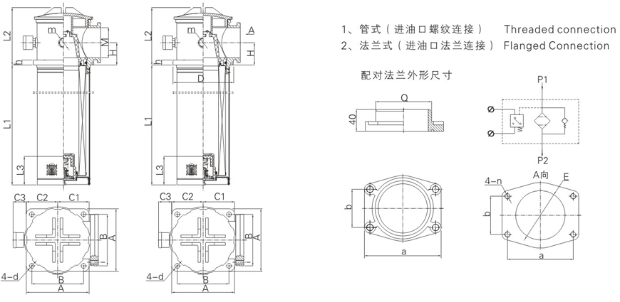 本過濾器直接安裝在油箱蓋板上,過濾器頭露在油箱外,回油筒體浸入油箱內(nèi),進油口設有管式與法蘭式連接,從而簡化了系統(tǒng)管路,使系統(tǒng)布置較為緊湊,安裝連接更方便。