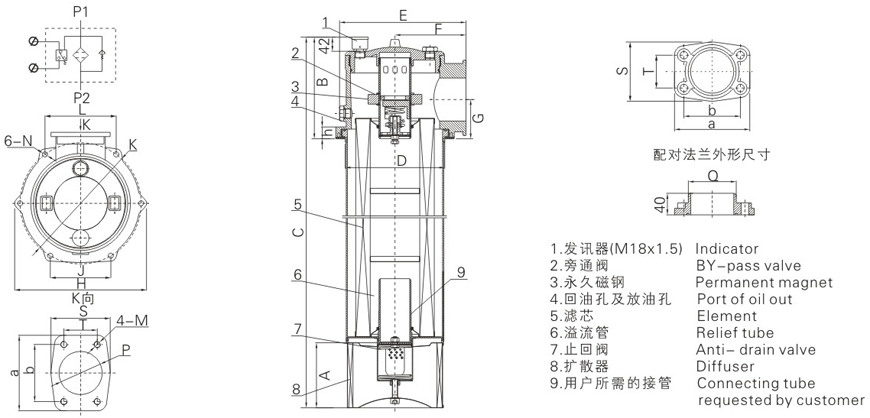 8、具有安裝連接及更換濾芯方便的特點(diǎn):進(jìn)油口為法蘭連接,對于濾頭與油箱安裝法蘭,用戶可按圖表中尺寸在油箱板上設(shè)計(jì)并加工6只法蘭螺孔即可。旋開過濾器濾頭頂蓋可更換濾芯或向油箱內(nèi)加油。