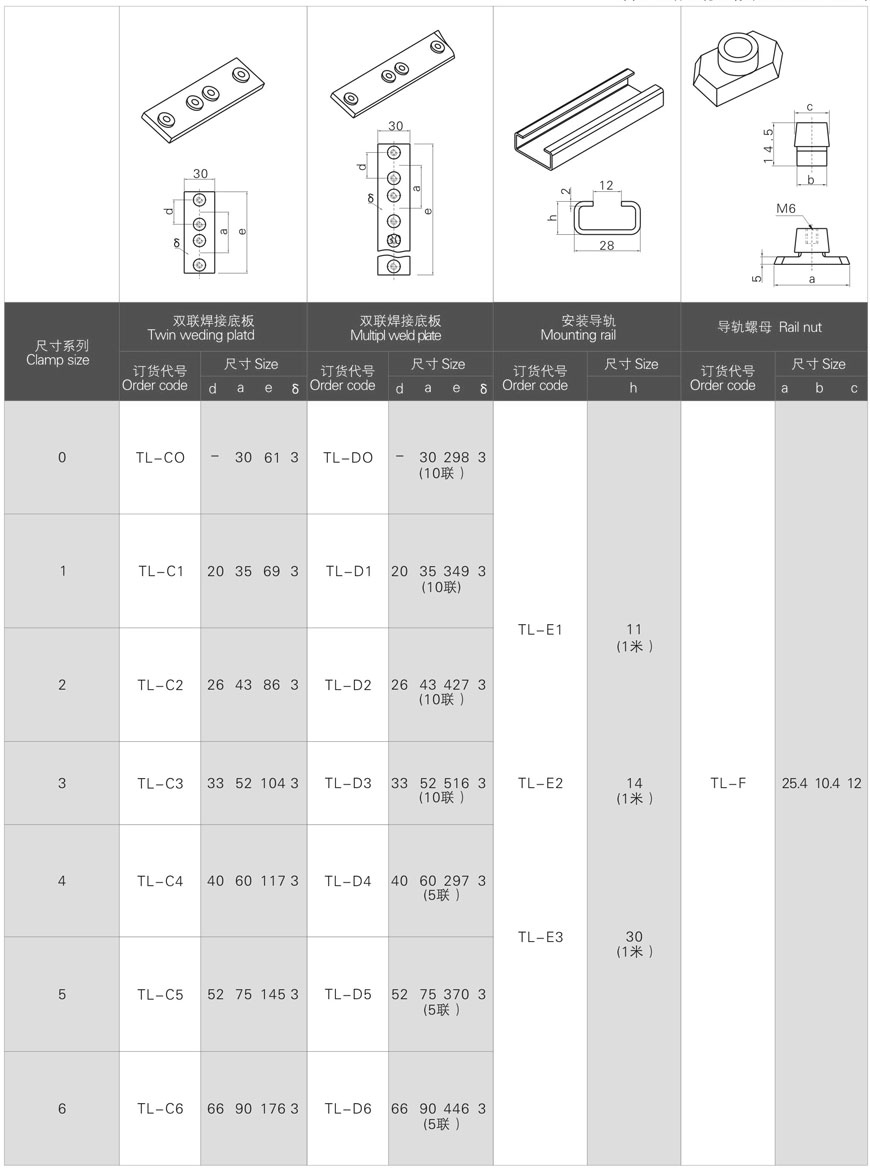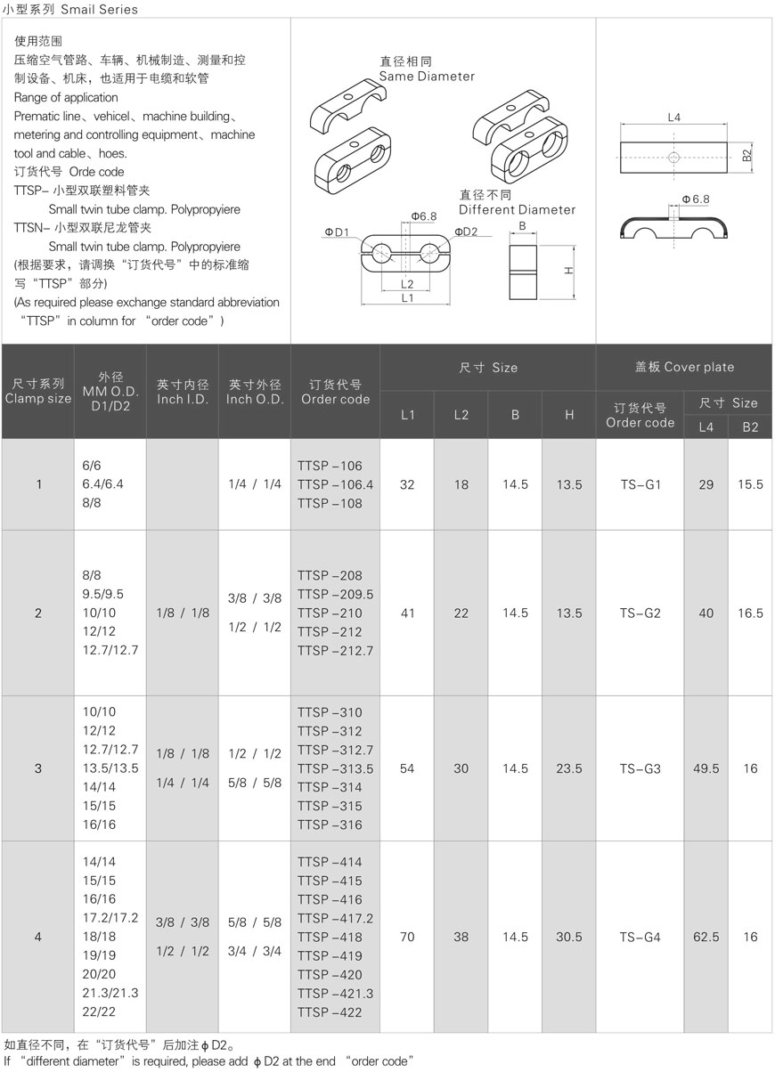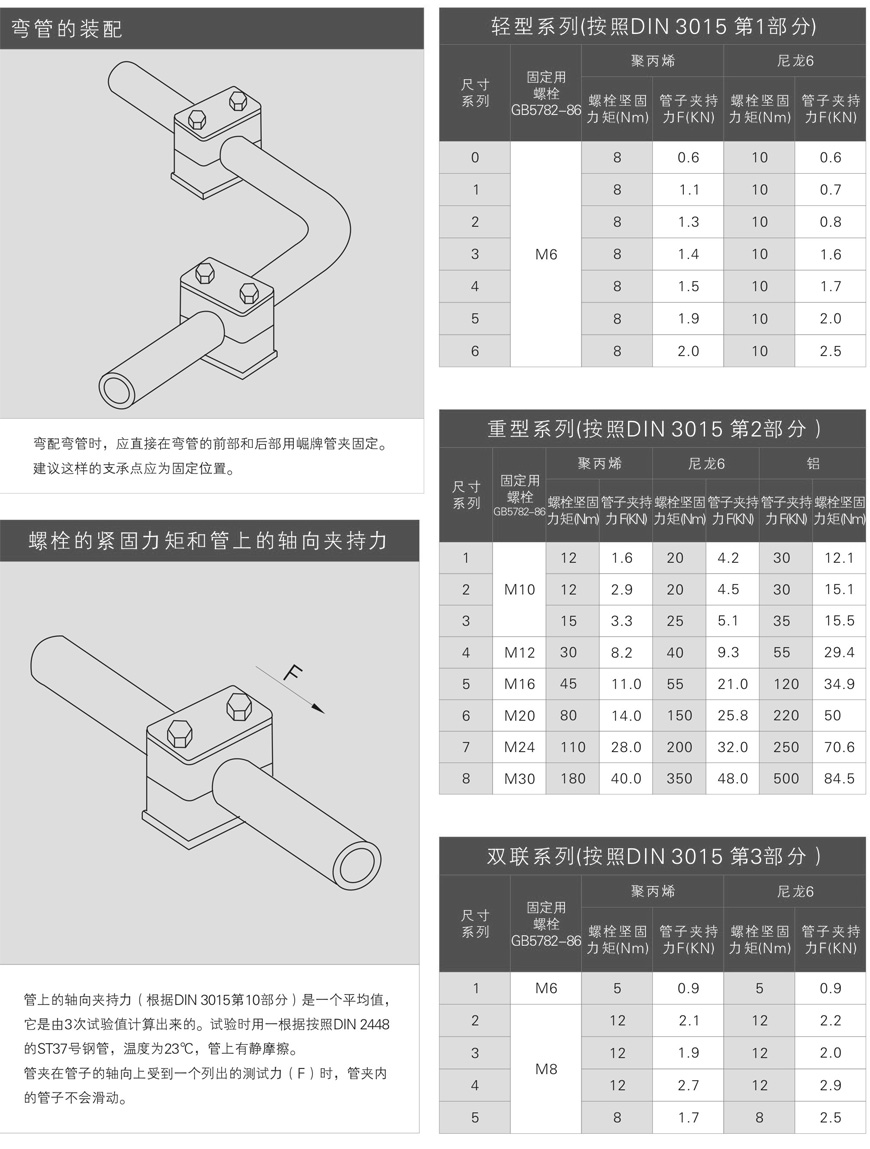 管夾適用范圍 輕型系列管夾應用于6種尺寸系列的普通機械壓力管子,管子外徑Φ6~57mm。 雙聯系列管夾應用于5種尺寸系列的普通機械壓力管子,管子外徑Φ6~42mm。 重型系列管夾應用于8種尺寸系列的高機械壓力管子,管子外徑Φ8~220mm。